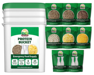 The most essential and highly sought after food source for survival is protein. The Valley Food Storage Protein Bucket supplies you with high-quality foods rich in protein.