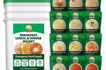 The Valley Food Storage Breakfast, Lunch & Dinner Bucket contains 8 of our most popular entrées and 4 of our best-selling breakfasts for a combined 75 servings of hearty and great-tasting survival food.