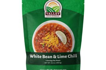 Valley Food StorageWhite Bean and Lime Chili features a thick and savory mild chili mixed with Great White Northern Beans, Pinto Beans, an assortment of vegetables and a hint of lime making it perfect for a quick and convenient lunch or dinner for